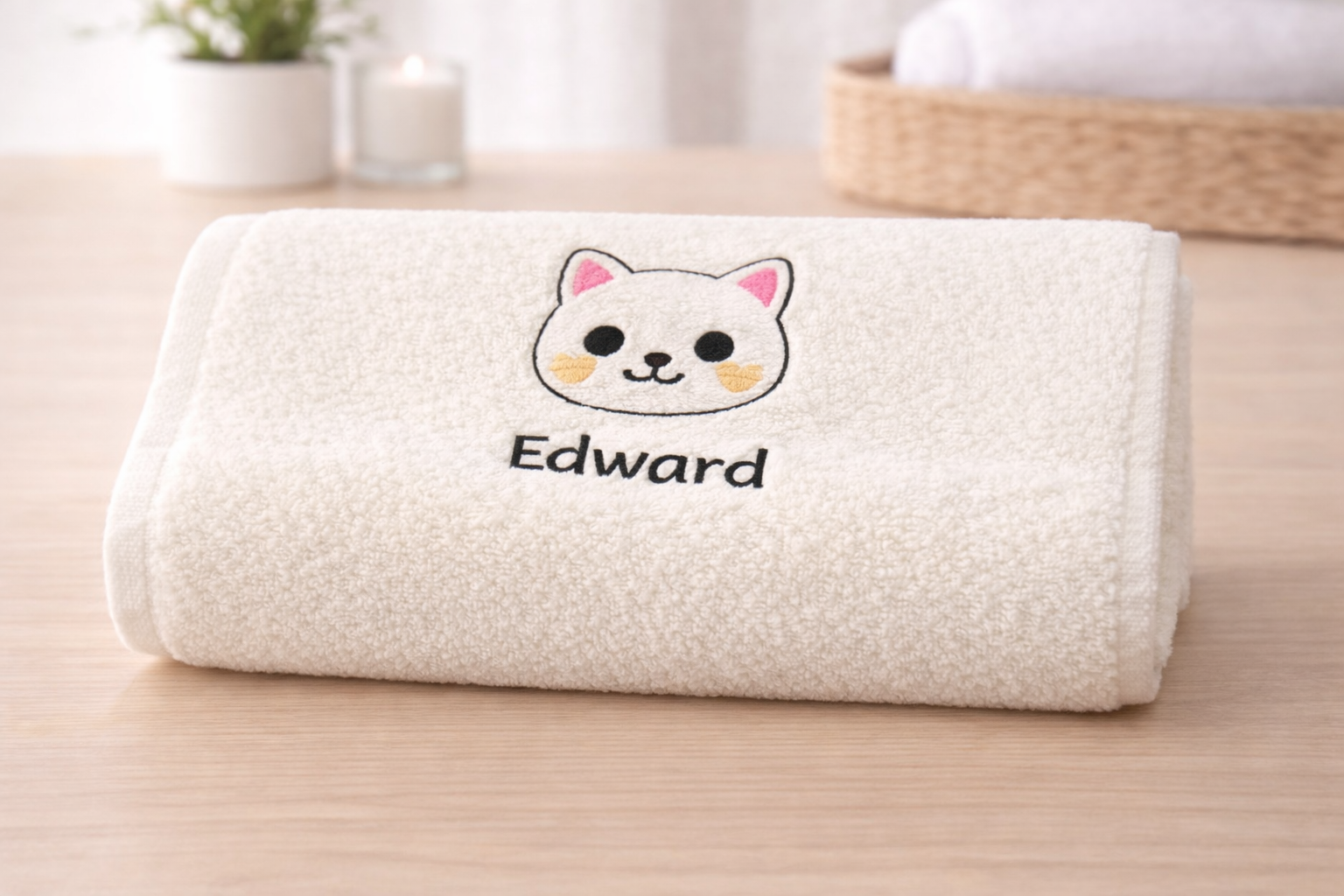 Each towel is embroidered with our signature Kitty design and your chosen name, making it a thoughtful and practical gift for children, babies, or anyone who loves something a little special.
